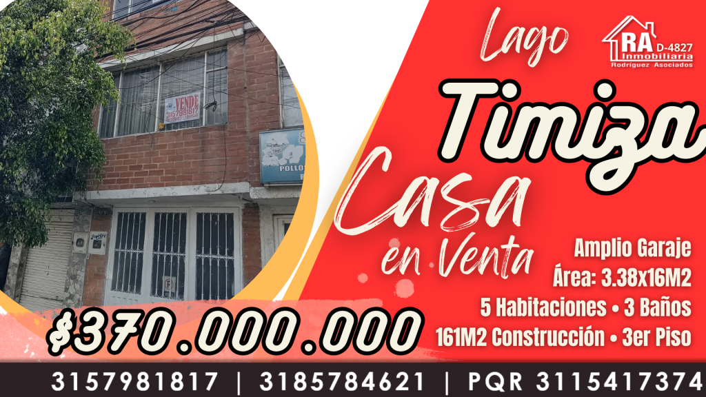 Casa De Tres Niveles Con Garaje, Excelentemente Situada En Lago Timiza D-4827 Casa En Venta De Tres Niveles En El Barrio Lago Tamiza, Ubicada En Un Sector Residencial Tranquilo Y Seguro, Con Excelente Acceso A Transporte Público, Instituciones Educativas, Comercio Cerca, Con Un área Lote De 3.38m De Frente Y 16 M De Fondo, Un área Construida De 161m² Construidos, Distribui...