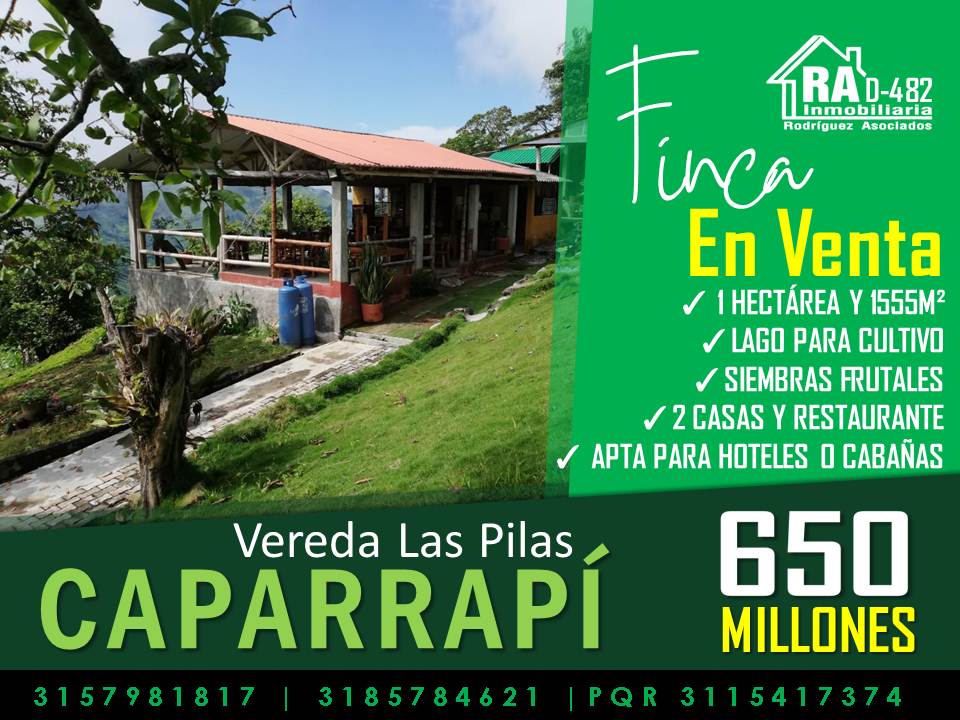 SE VENDE FINCA CON DOS CASAS Y GRAN POTENCIAL PARA PROYECTO TURISTICO EN CAPARRAPI D-482 Maravillosa finca semiurbana (salida a Utica) para la venta en caparrapi vereda las pilas sitio la unión, situada a 500m del batallón del ejército con un área de terreno de 1 hectárea y 1555m² cultivada en aguacate de diferentes variedades además de tener un lago para cultivo de peces. Cuenta con dos casas amplias cada una con sala comedor cocina tres habitaciones y baño construcción moderna; un restaurante apto para cien personas en funcionamiento. Además tiene con luz trifásica acueducto urbano y vereda. es una finca apta para cabañas, hotel campestre y/o proyecto eco –turístico. Muy buenas vías de acceso y queda a 5 minutos de la plaza central del pueblo. Valor de $650.000.000 INMOBILIARIA R.A “Nacimos para servir” Contáctanos vía WhatsApp: http://wa.me/573185784621 http://wa.me/573157981817 Conoce nuestros inmuebles: WEB PAGE: http://inmobiliariara.domusweb.co/