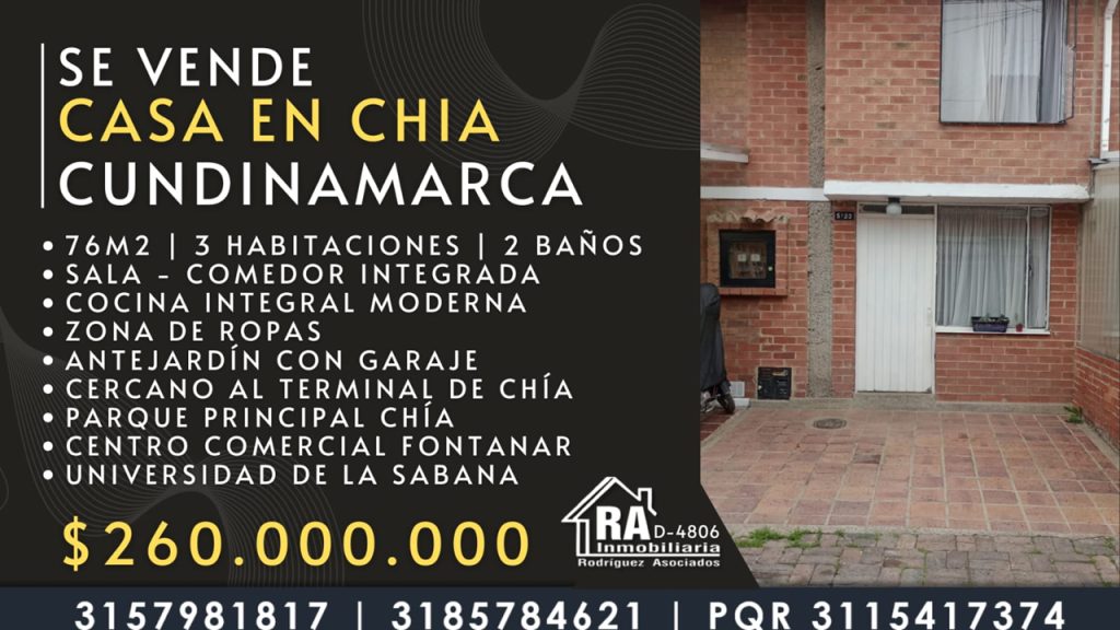 SE VENDE HERMOSA CASA DE DOS PLANTAS CON GARAJE MUY BIEN UBICADA EN CHIA CUNDINAMARCA D-4806 Se vende hermosa casa de dos plantas con un área construida de 76 m², ideal para familias que buscan comodidad y buena ubicación. El lote tiene unas dimensiones de 3.50 metros de frente por 14 metros de fondo. Distribución: - 3 habitaciones amplias - 2 baños completos - Sala-comedor integrada - Cocina integral moderna - Zona de ropas - Antejardín con espacio para un vehículo La vivienda está ubicada en una zona urbana del municipio, garantizando acceso a todos los servicios y comodidades. Ventajas y características: - Propiedad libre de deudas e hipotecas - Acepta pago al contado - Precio: $260.000.000 COP Lugares importantes cercanos: - *Terminal de Transporte de Chía:* A solo minutos, facilitando la movilidad hacia Bogotá y otras ciudades. - *Colegio Stella matutina y colegio Liceo lunita:* Institución educativa reconocida, ideal para familias con niños. - *Clínica Chia:* Centro médico de alta calidad para atención en salud. - *Parque Principal de Chía:* Espacio para recreación y eventos culturales. - *Centro Comercial Fontanar:* Gran variedad de tiendas, restaurantes y entretenimiento a poca distancia. - *Universidad de la Sabana:* Reconocida universidad con programas académicos de excelencia. Contacto: Para más información o para agendar una visita, no dudes en contactarnos. Esta es una excelente oportunidad para vivir en un lugar tranquilo, bien ub